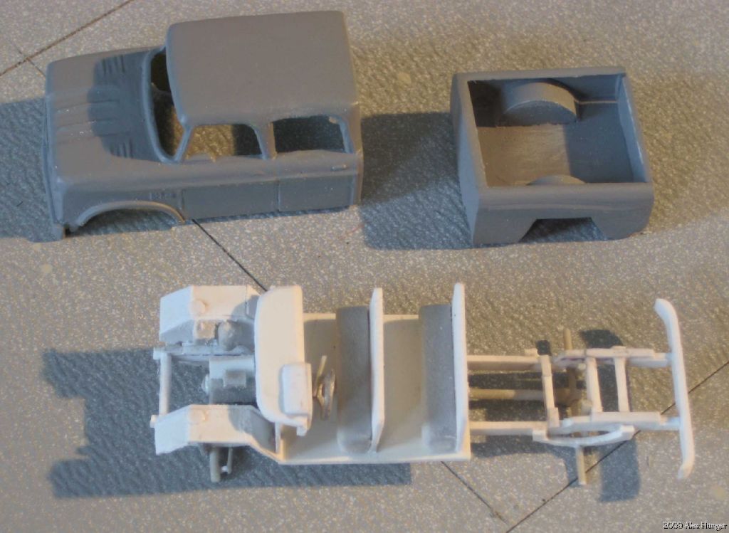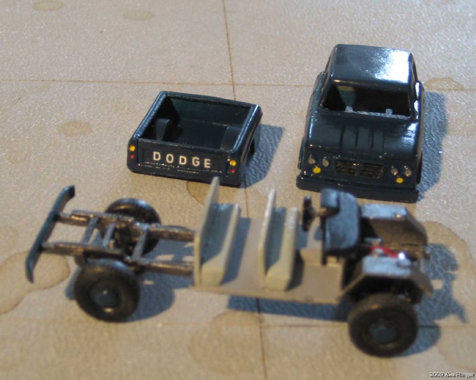 All I had to do now was to scratch build the truck bed and the chassis. Careful measurements however revealed that Matchbox had built this die cast in about 1/79 scale in order to make it fit in the standard box. This was not insurmountable, but precluded making molds for possible series production as an off scale vehicle would be quite obvious. Nevertheless, it was relatively easy to build a truck bed using left over plasticard. A little more effort was required for the chassis on which the cab and the truck bed would be mounted. Fortunately, Google revealed quite a few photos of the suspension and trans-axle as well as well as the interior and even a cut away of a simple D-100 pick-up. Two shaped beams served as the frame, while a sheet of plasticard served as the base for the seat and the instrument panels. Following this, the hand made engine, wheel arches, suspension, axles and many other details were added. Due to a lack of information, I only omitted the exhaust system and fuel tank, while I didn't want to waste a wheel for the spare tire under the rear frame at this stage of the game. Also, the rear view mirror was omitted, as I guessed that it would break off within 5 minutes anyway! This detailing only took 2 evenings and was quite rewarding from an engineering point of view.