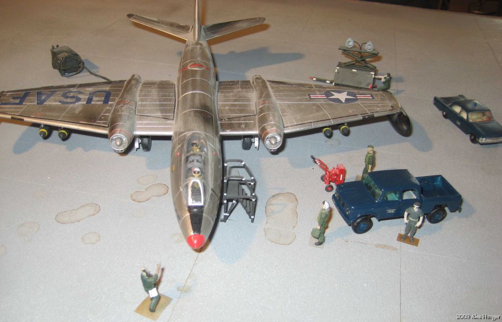 A small colour touch up brought out the lights and radiator, while the decals readied it for a photo shoot with some Hasegawa crew figures and a an Italeri B-57 on a Vietnam flight line. The oil stains on my taxiway are actually tea stains and the sedan in the rear is a Matchbox Ford Fairlane I did earlier.