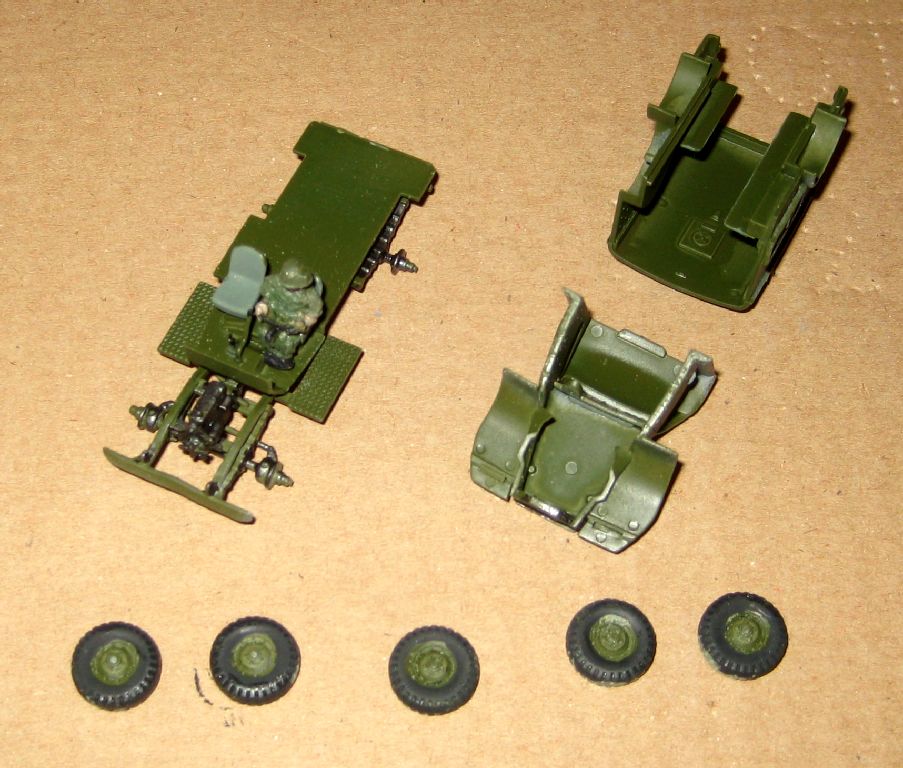 The whole lot was then glued to the frame and front body and the joint between front and back was filled. After a bit of sanding, the orifices in the cab and rear where closed up with tissue paper while the drivetrain was masked with tape. The whole lot was primed and the sprayed with the trusty Tamiya OD.