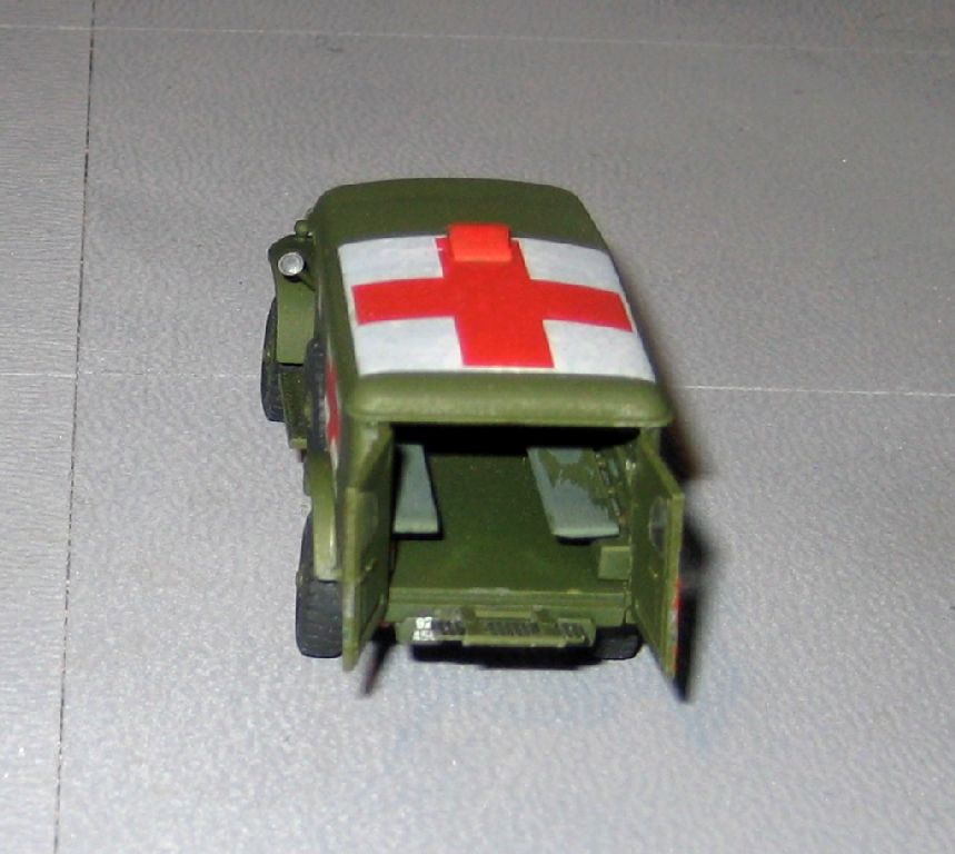 The rear body was a bit more wobbly. The bench like stretcher attached to the sides confidently, but the fit between roof and side panels was more iffy. Again, the insides were primed and spray painted OD. The beds for the stretcher were hand painted in a more faded shade of green.