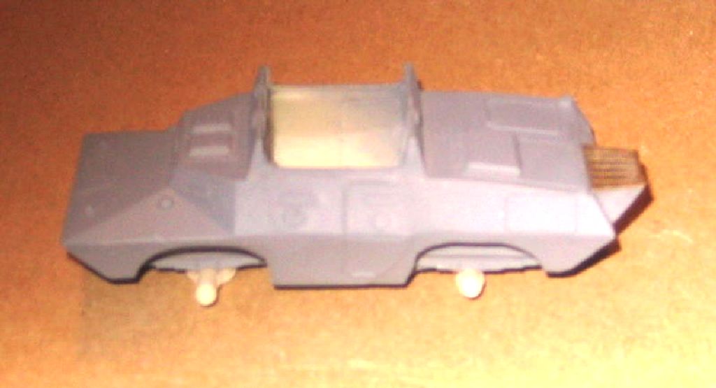 I also built up again the wheel arches and the hull bottom with plasticard. Dents and scratches were filled and sanded before the attachment of the axles so that the entire hull could be primed in Hallfords grey. The interior was primed in Hallfords white before receiving a couple of coats of Hallfords Nissan White. No further attempts were made to detail the interior. Most of the etched brass details were attached to the Hull with superglue while the wheels were worked up separately