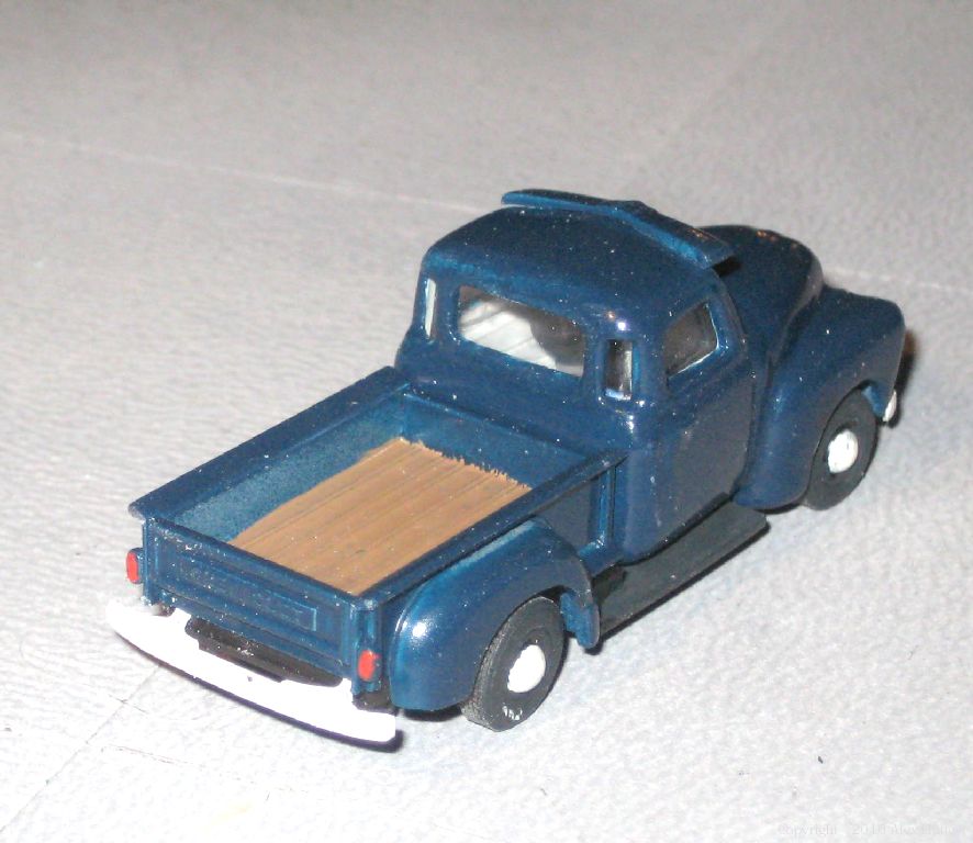 The interior was done in gloss white with gloss baby blue seats. The exterior is Ford Atlantic Blue from Hallfords. The truck bed is tan to simulate the wood. I ommited the spare tires. The normal tires received a coat of Nato Black to remove the whitewalls while the hubcabs were done in gloss white.