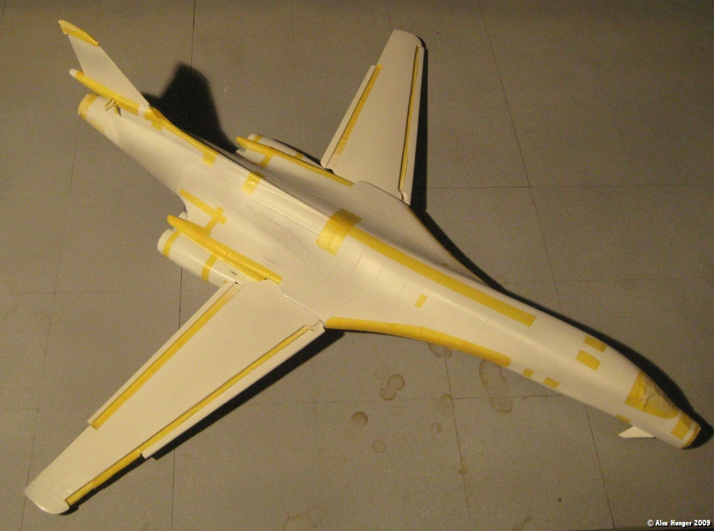 Due to the dropped flaps and slats, the wings no longer swing.The rear ECM indentations is also blanked off by plasticard covers. Large parts of the aircraft where painted white and masked with Tamiya tape before painting in Gunship Grey.