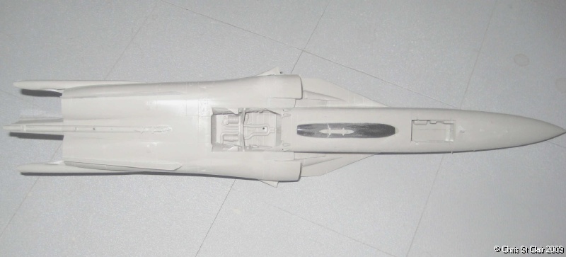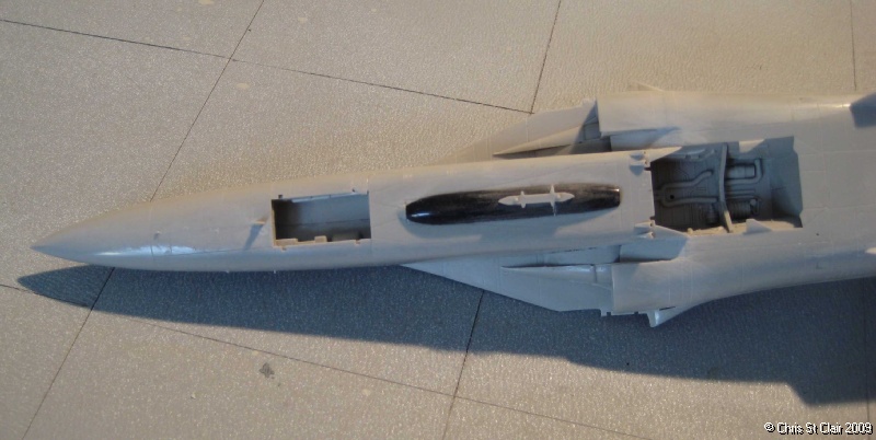 While the Hasegawa bomb bay doors for the Pave Tack unit was installed, I used a shortened and sanded down Hawker Hunter drop tank for the bulge istead of the kit Pave Tack device. The data Link pod was a sanded down resin drop tank from an unknown kit. Unfortunately it doesn't show up well on the photo due to the black background.