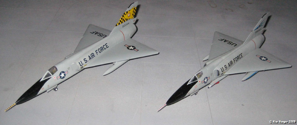 So, in total, I now have a completed fleet of 5 completely different F-106 Delta Darts, using what would politely be called 4 junk kits. While some would argue, that the Hasegawa Kit is long in the tooth, it’s simplicity and solidity make it a viable candidate for new builds and rebuilds, if super-detailing is not required, as only the panel lines need recarving. A clean paint job and nice decals are most effective for a colourful fleet of the Dagger. Repairing mouldy old kits is also a viable solution for generating nice new models for the collection.