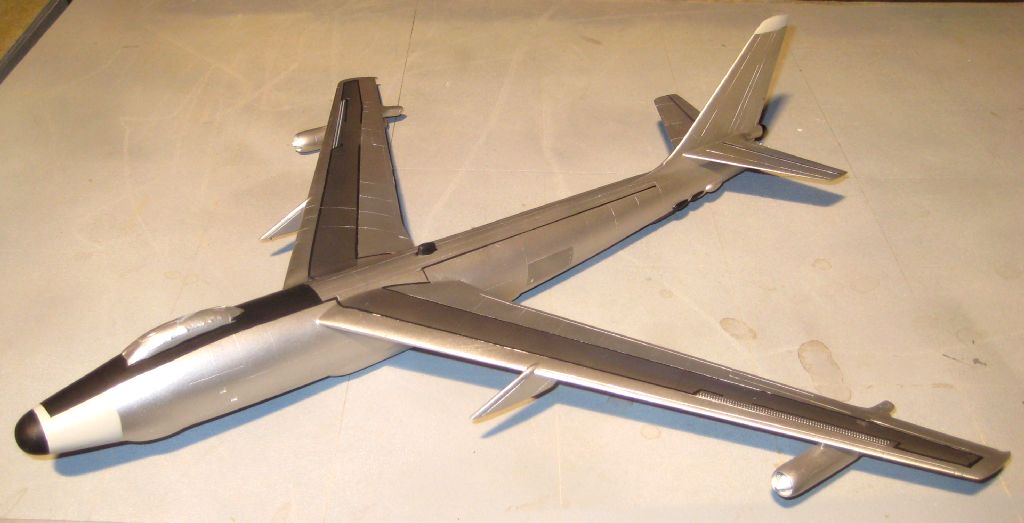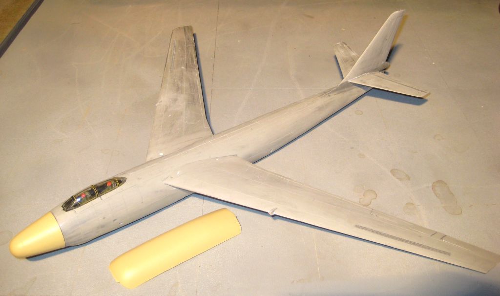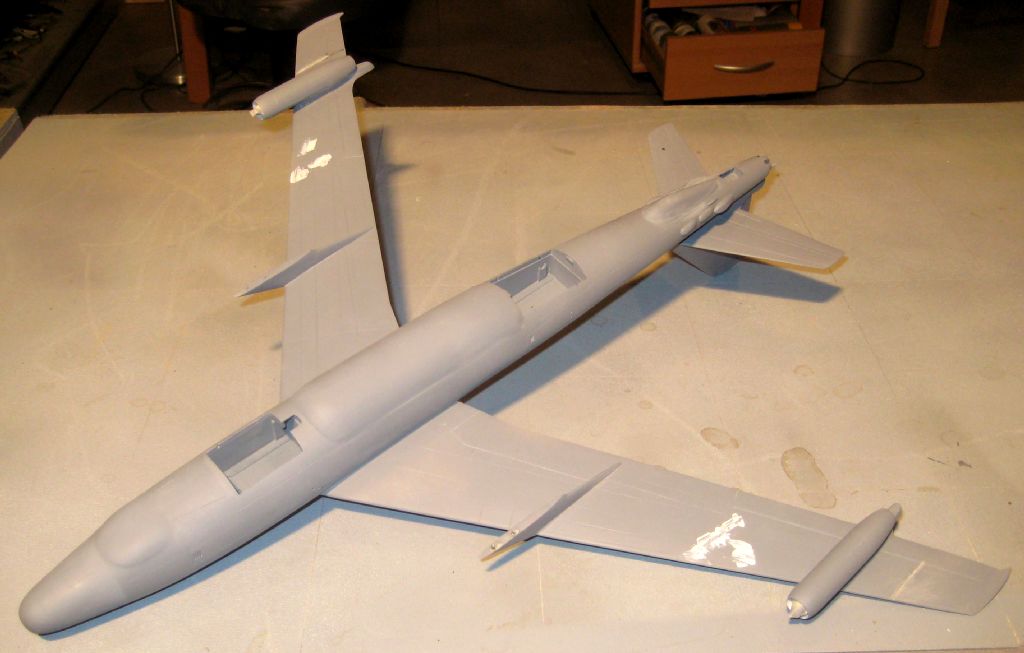 With the panel lines gone, I could then sand off all the paint in order to provide a smooth surface for the new paint job. That out of the way, I super glued, the new nose, wing tips and extra rear metal radomes and also cut a slot into the outer lower wing for 2 suspended antenna pods. The bulged resin bomb bay required some rebending in boiling water to fit properly as it had contorted while in storage. Even then, it required a couple of strips of plasticard and quite some filler to fit smoothly into the orifice. The guns could then also be reattached. I also nearly forgot to close up the holes for the drop tanks, as the RB-47H has not been photographed with them attached as far as I can tell.