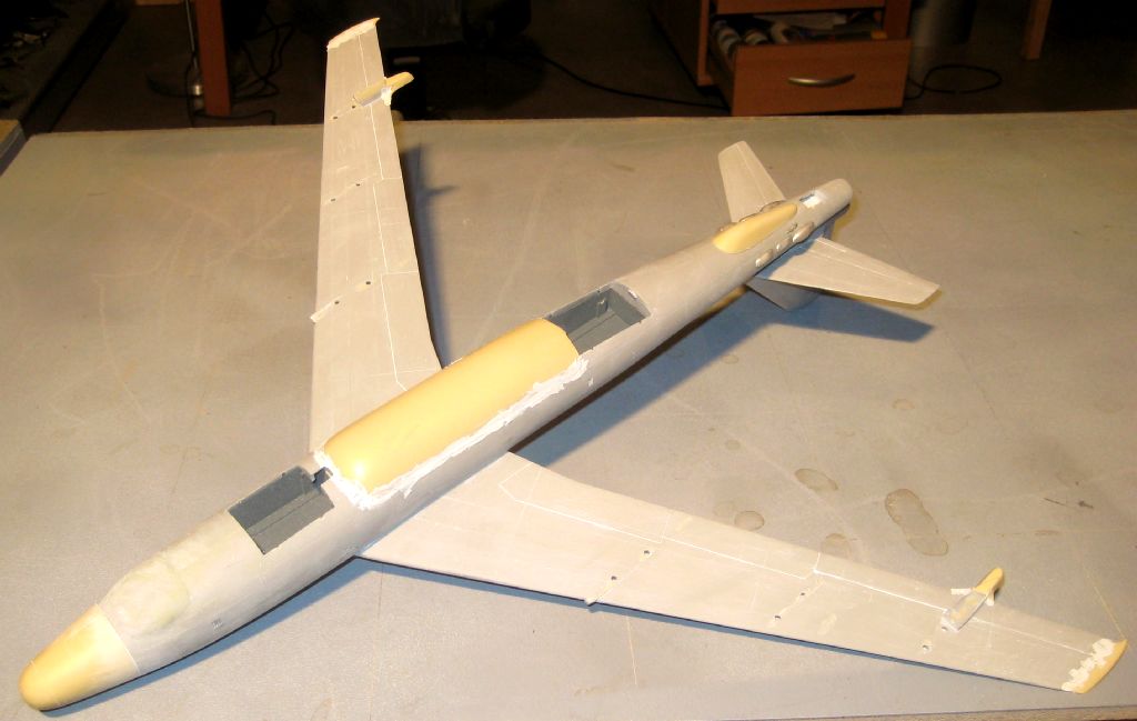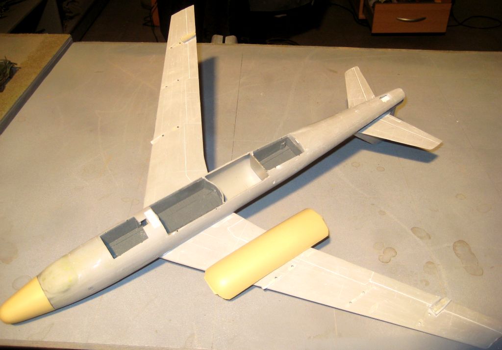 To begin with the damaged hull was cleaned up. Further excess parts, such as tail gun, the last remaining landing gear and the drop tanks were removed to simplify restoration. Joints were then resanded and the remaining half of the bomb bay as well as the wing tips and nose were sawn off. I then recarved all the panel lines. In parallel, this was also done on the main engines pods that had fallen off previously.