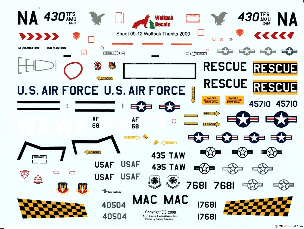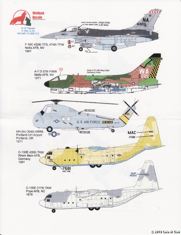 To say "thanks" to their customers, Wolfpak printed a special Christmas sheet which was only available to customers spending over $30, and is a limited run only. It contains some very interesting subjects, including an F-16A from the 474th TFW, AS-7D from the 57th FWW, an HH-34J from the 304th ARRS and two C-130Es in trial camouflage schemes. The airframes covered are as follows:-
