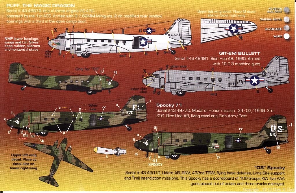 - FC-47D 43-48579 "Puff, The Magic Dragon" operated by the 1st ACS. Overall natural metal finish with white upper fuselage and FS36440 Gull Grey nose;