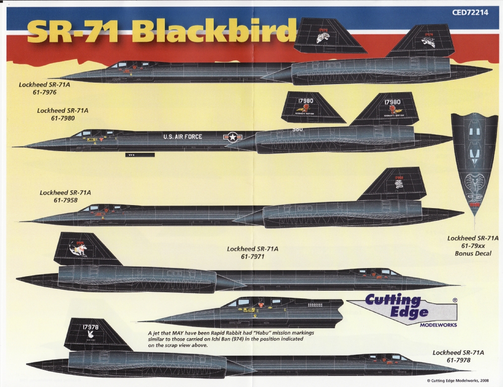 - SR-71A 61-79xx Habu - this was an SR-71A nose with the HABU markings applied. The only photograph shows the nose mounted on a maintenance stand in a hangar in the mid-1980's - you thus could potentially apply it to any SR-71 from that time period;