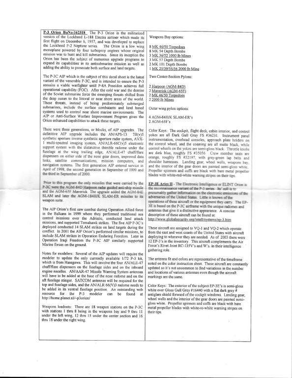 - P-3C AIP Orion BuNo 162318 from VP-46 "Grey Knights" based at Whidbey Island NAS during 2006, painted in overall Gloss Gull Grey (FS16640);