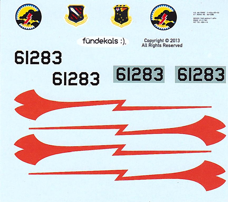 Markings are provided for a single airframe - 56-1283 - and comprise unit badges, radio call numbers and lightning stripes for the wing fuel tanks.