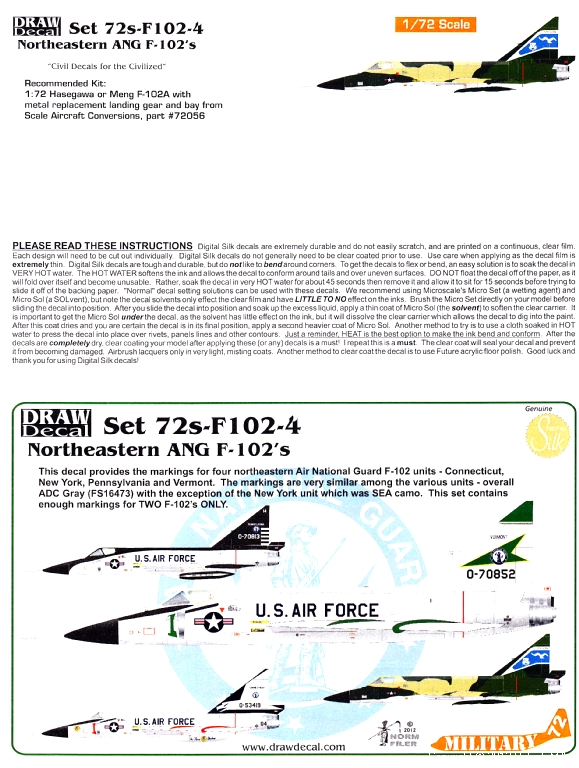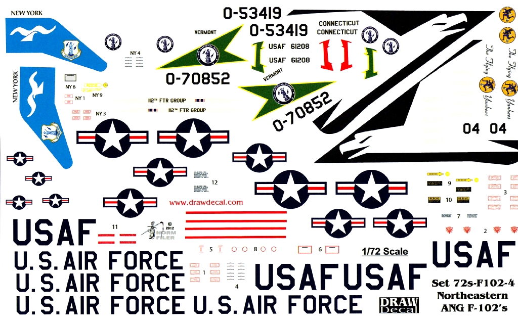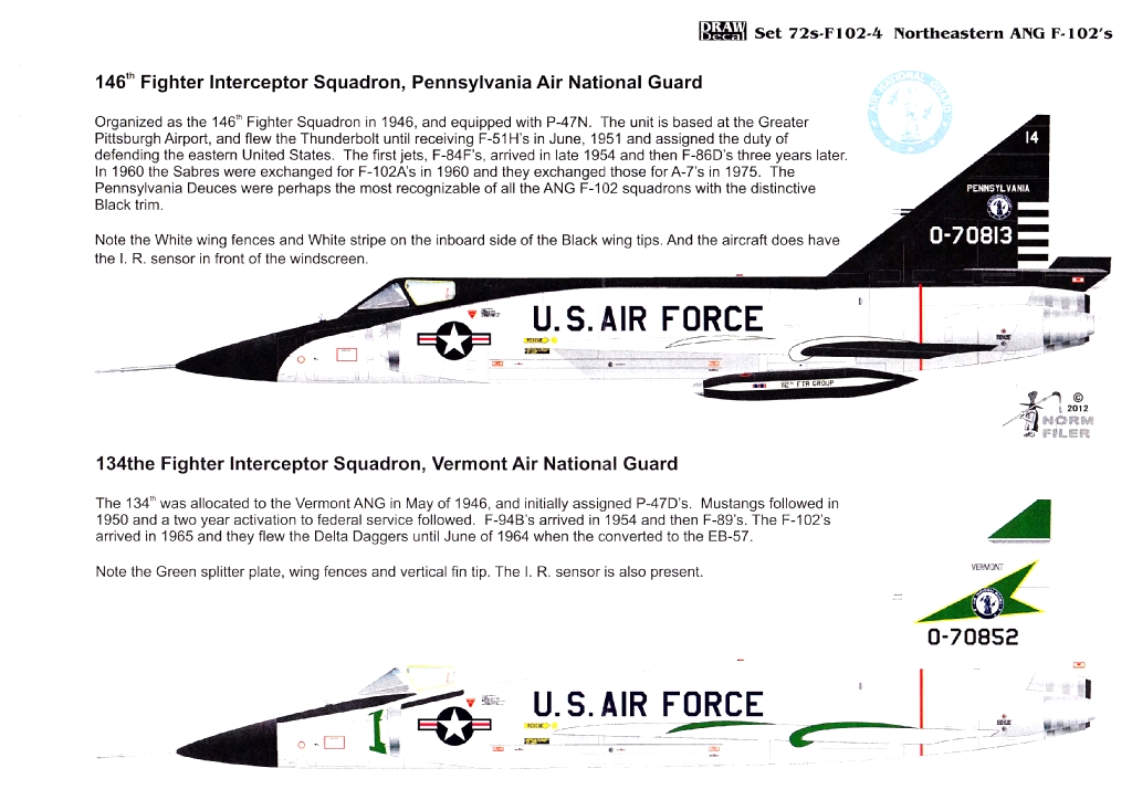 Draw Decal sheet 72s-F102-4 contains markings for 4 F-102As from Northeastern ANG units and covers Connecticut, New York, Pennsylvania and Vermont ANG aircraft. The aircraft featured are as follows:-