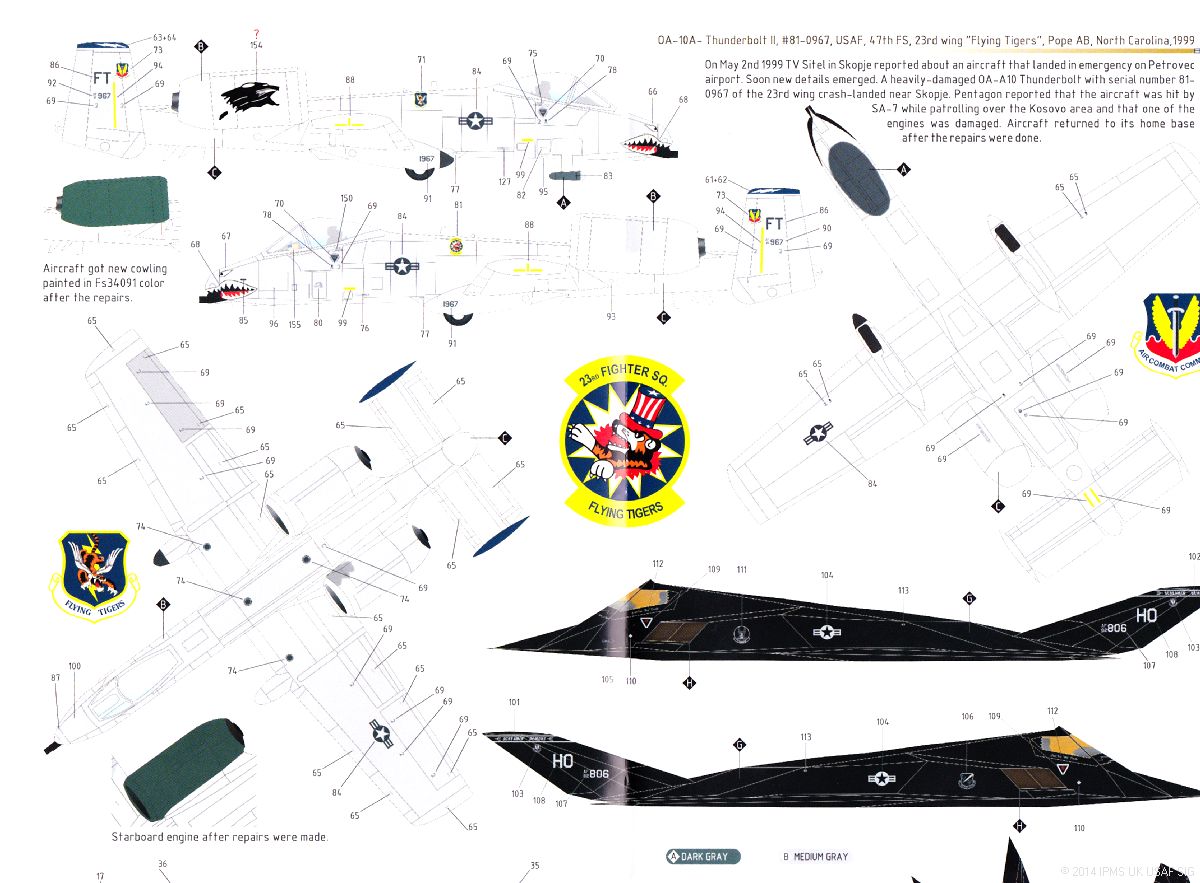 - OA-10A 81-0967 from the 47th FS, 23rd Wg based at Pope AFB, North Carolina during 1999. Two tone grey scheme (FS36270 & FS36375) black "FT" tailcodes, blue fin cap containing a white lightning flash, full color shark mouth and cat's head on the engine nacelle; and