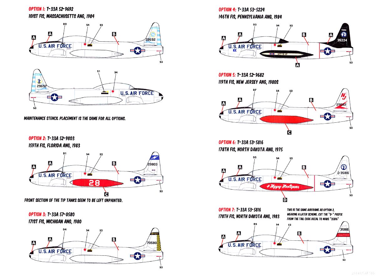 - 52-9692 T-33A-1-LO from the 101st FIS, Massachusetts ANG during 1984. This aircraft carried a light blue/white horizontally striped rudder, a blue/white arrowhead on the fin, a blue fin stripe containing "MASSACHUSETTS" in white, and "Cape Cod" in white outlined in blue on the wingtip fuel tanks