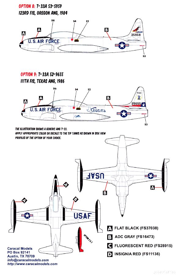 New markings for the T-33A have been thin on the ground, despite the recent release of the Sword and Platz kits. This new sheet from Caracal provides markings for aircraft from nine different Air National Guard units. The individual aircraft featured are:-