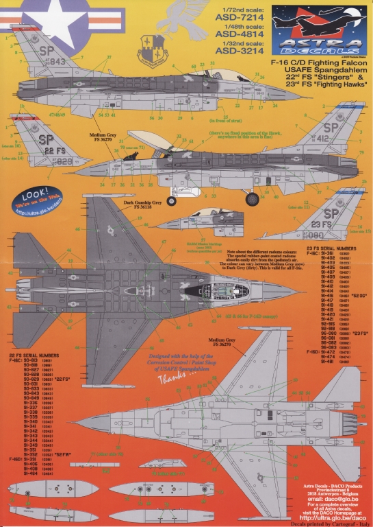 Latest in the range of decals from Astra, this sheet covers a number of aircraft from the 22nd and 23rd FS based at Spangdahlem AB. Few of the aircraft featured wear "special" schemes, but the upside is that the markings allow for any of 49 different airframes to be modelled!