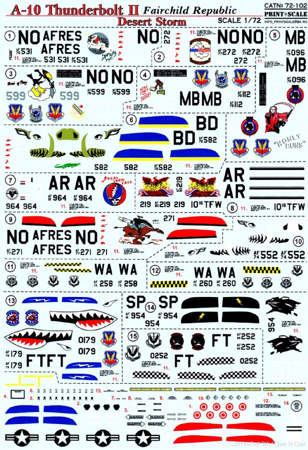 Sheet 72-102 from Print Scale provides markings for 15 different A-10s. These are mostly from the Desert Storm time period, but some experimental camouflage schemes are also provided. Airframes featured are:-