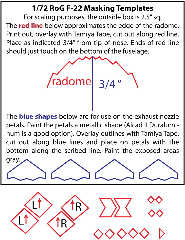 In general, the various diamonds that are colored light gray should be 36375 Light Ghost Gray, except where specified as 36251 Aggressor Gray. The diamonds that are yellow or dark gray represent screens and should be Metalizer Gunmetal. If I were using this decal sheet, I would proceed as described above, using the decals as a pattern to cut masks from using Tamiya Tape. It will take longer, but the result will be much more realistic. Specific errors noted:-