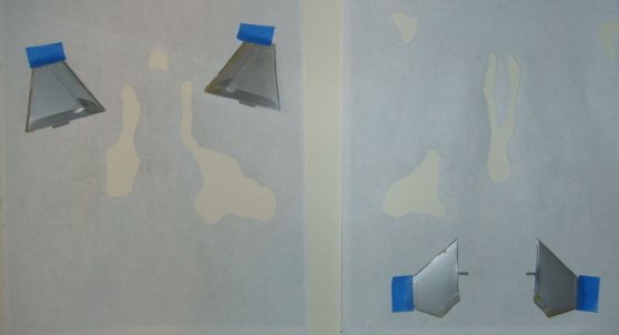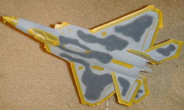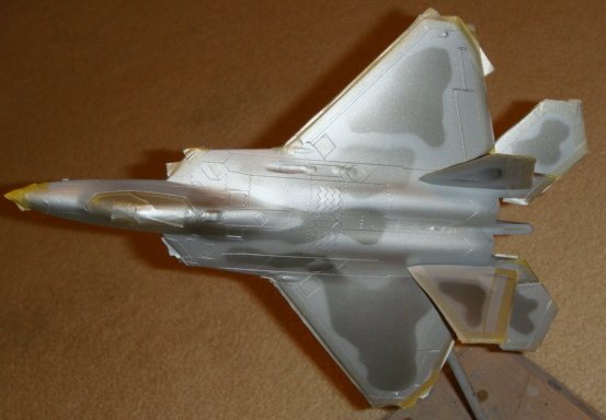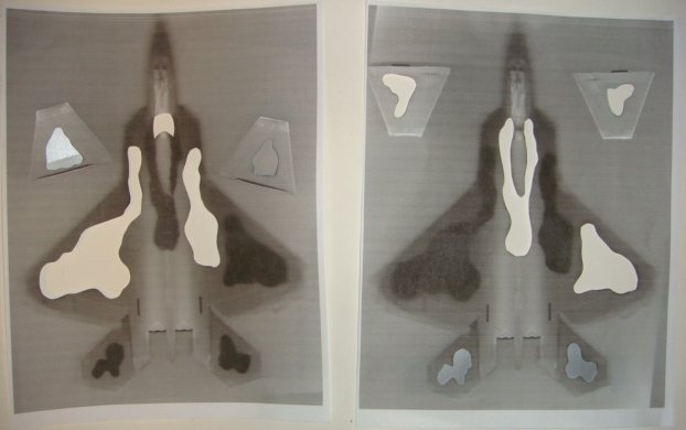 2) If desired, pre-shade selected areas dark gray. I got a LOT of questions about this at my local club. What I did after the Light Ghost Gray was thoroughly dry was to refer to photos and sketch the pattern of the darker silver gray pattern on the model. I then sprayed this pattern Gunship Gray (36118), not bothering to make it a solid coat. I then made a photocopy of the top of the fuselage, horizontal tails, and both sides of the vertical tails. I cut out the dark parts of these copies to make masks that were used after the light metallic silver had been applied.