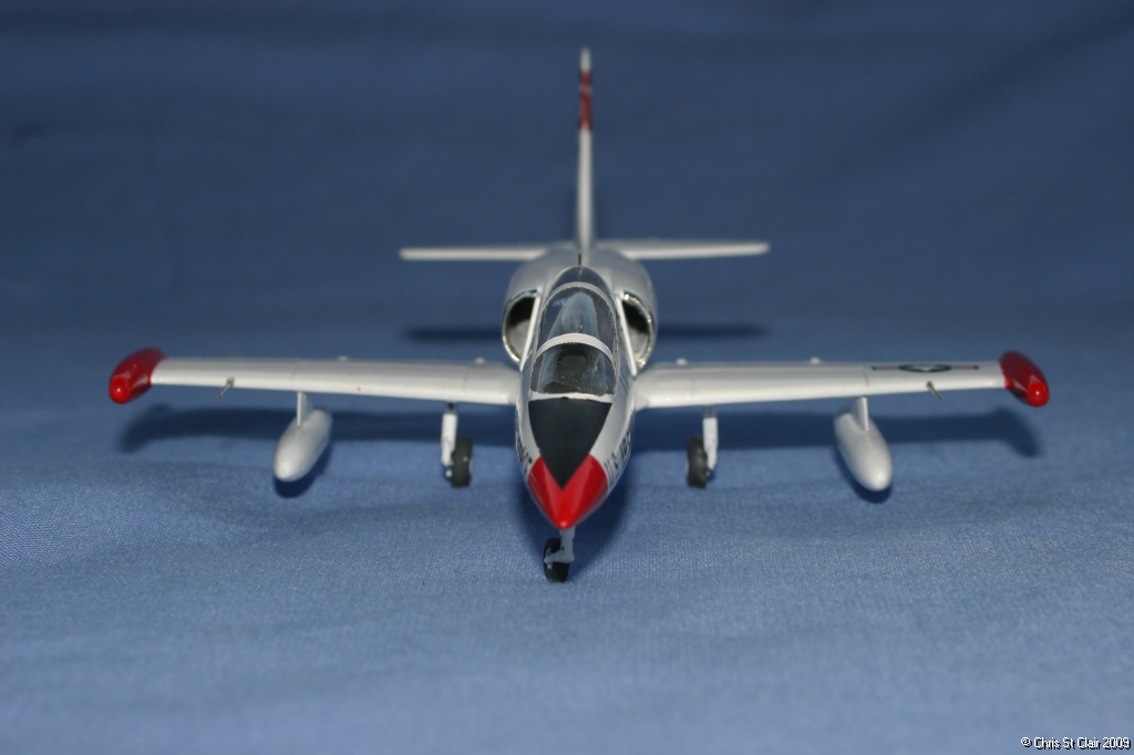 Final details were the undercarriage from the kit - the L-39 is unusual in that the gear doors are closed unless the gear is extending or retracting. I used black and white plastic card for the various aerials and pins for the pitot probes on each wing. Bare-metal foil polished with graphite was used to represent the metal jet-pipe area.