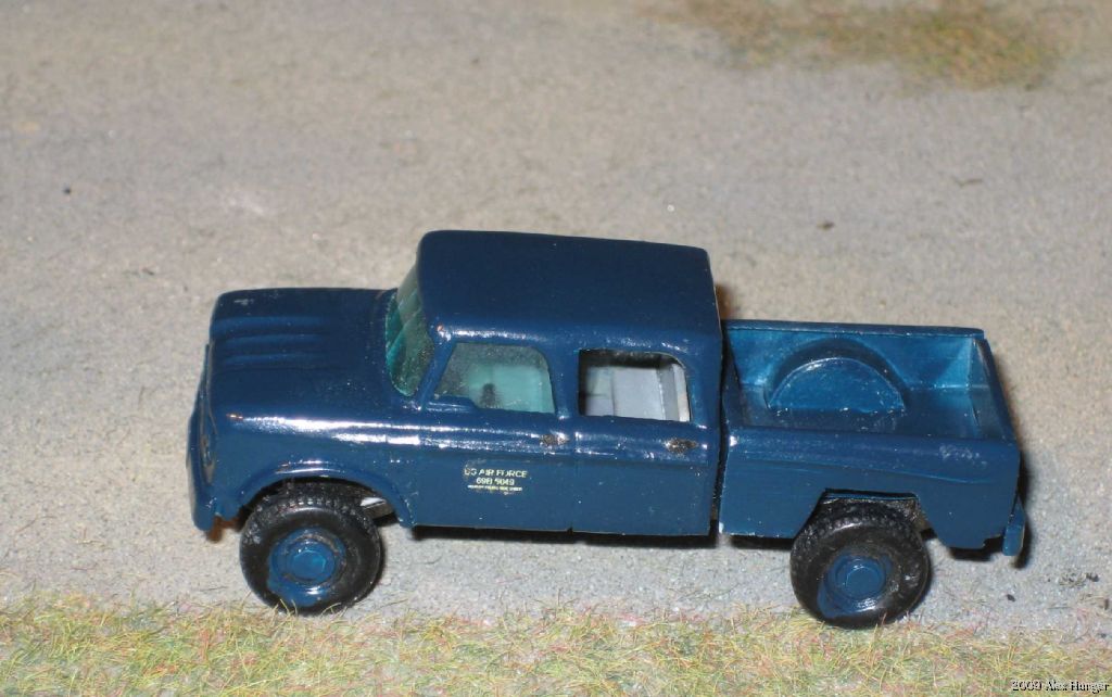 Sometimes your old toys come back to haunt you. As a child I had quite a few Matchbox toy cars and for some reason, my favourites were always the boxy American cars from back in the days when the US car industry was still something to look up to. Those toys didn't survive my adulthood, but somehow I found out that many of these die cast cars scaled in between 1/72nd and 1/75th. Also, Halfords Atlantic Blue spray paint was a near complete match for USAF blue used on many staff cars and vans, which allowed me to convert many cars, station wagons and pick-up truck into suitable diorama models over the last 10 years. My friend Haydn from the USAF SIG even prepared a sheet of decals for them.