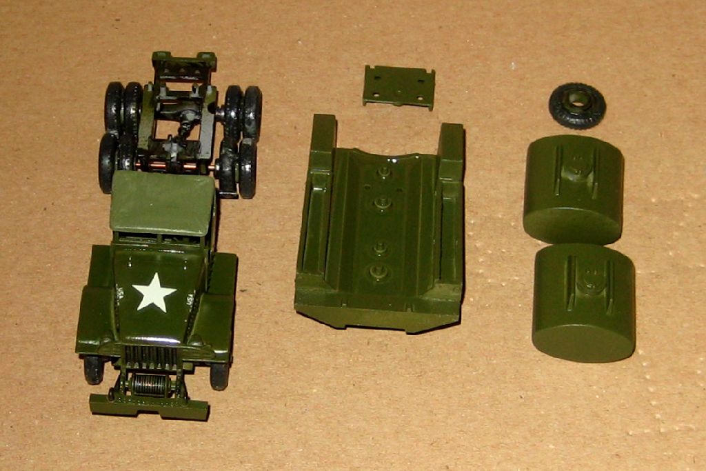 The cab received a plasticard blanking plate between the driver compartment and the engine compartment, even if the dead space is not that visible with the driver in place and the soft top on. Frame and cab were wedded and primed. The ensemble was then sprayed with Tamiya Olive Drab 2 while the frame, engine and axles were done up in Tamiya Gun Metal Acrylic paint.