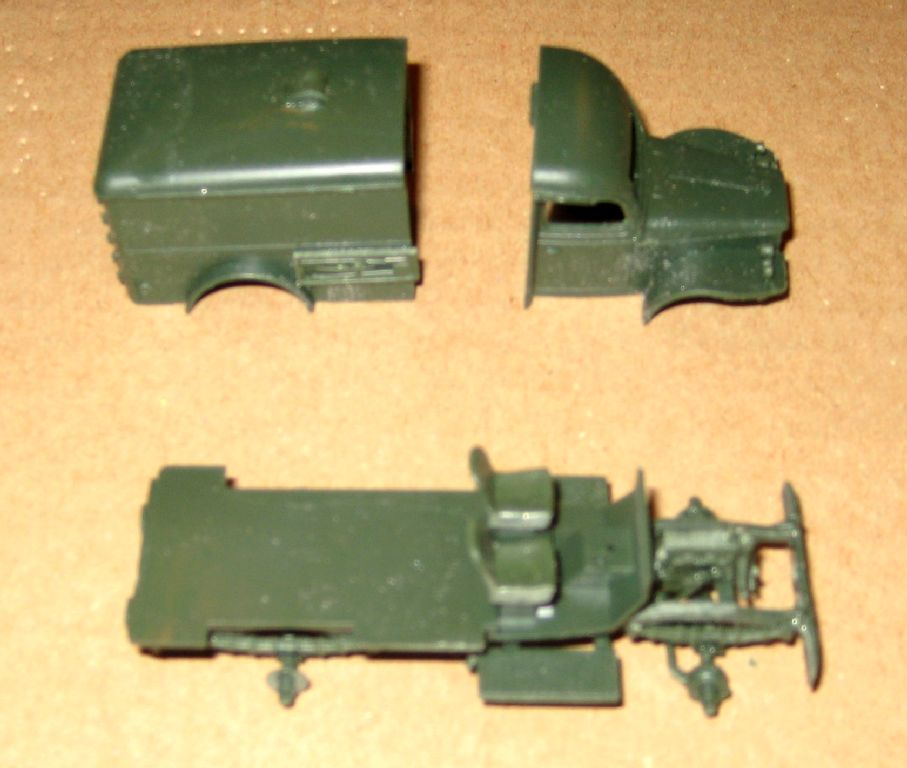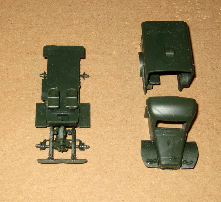 Now the body could be dealt with. The front of the cab went together easily, except for the filler above the door, which had some fit issues. This was again primed and the insides were sprayed Tamiya OD green before being glued onto the frame.