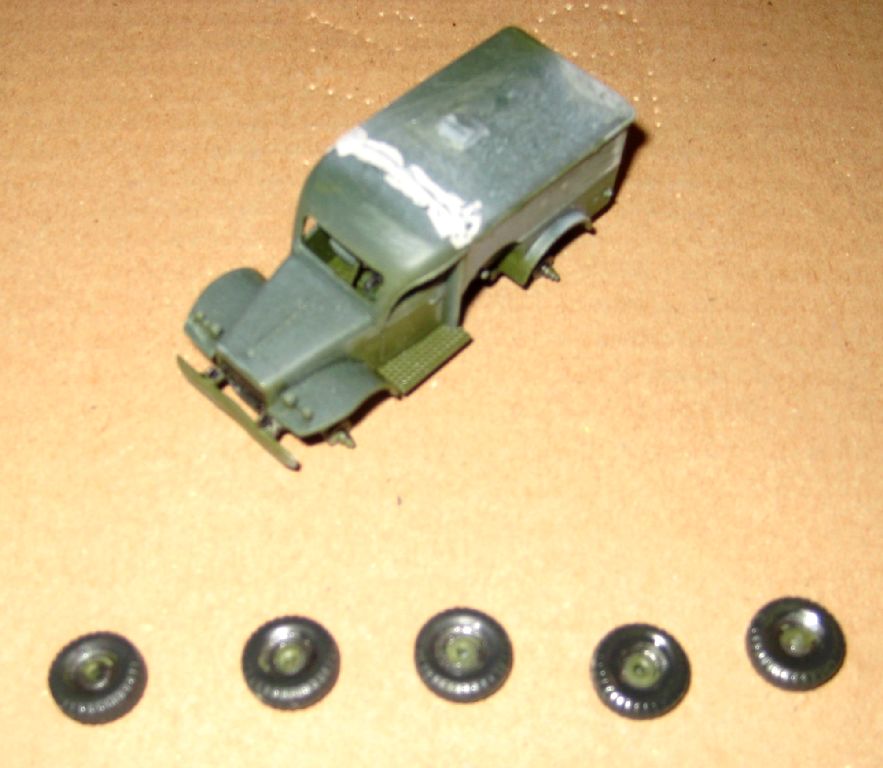 The entire body was again sprayed in gloss to seal in the decals. The prepainted wheels could now be attached and the truck was again sprayed in Extracolour Matt varnish. Last but not least, the windows were installed and frames were touched up in OD. The drivers side window was left out in order to make the figure more visible.