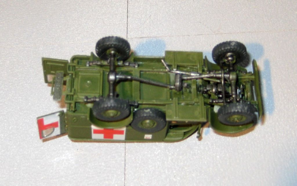 The rear body was a bit more wobbly. The bench like stretcher attached to the sides confidently, but the fit between roof and side panels was more iffy. Again, the insides were primed and spray painted OD. The beds for the stretcher were hand painted in a more faded shade of green.