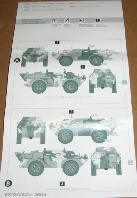 When the Czech Extratech company introduced the turretless USAF version a couple of years back, I jumped before looking. On opening the box, I was disappointed that the extremely finely moulded kit was marred with covers on the center opening. The kit did feature an excellent etched brass set and interesting decals for actual Vietnam operated vehicles as well as superlative instructions. It was just that my diorama idea wasn’t going to pan out with the insides of the vehicle plugged up with resin.