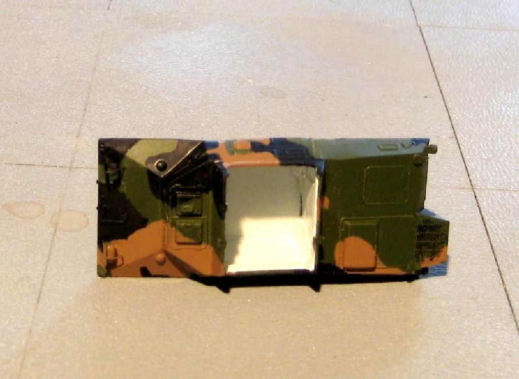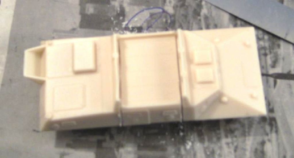 I just needed to take the body section and draw pen lines on the front and back of the passenger compartment, as limited by the small upright glacis plates. I stuck a thin rotary saw blade into my trusty old Minicraft drill and cut around the entire model, effectively slicing it into 3 parts at first. The inside front and back were cleaned up a little to smooth out the cut marks. I then took the center section and again drew pen lines just inside of the side of the angular hull. The sawed section required a bit more cleaning up due to the inconvenient angles, but there were no major problems. From the cover art, I could tell there was a hatch to the engine compartment and I assumed it would be possible to discern the panel lines for the 2 doors on the inside. These were loosely carved into the resin without much of a fuss. I assumed there would be some sort of hatch on the front, but can not prove this as there is no information on the web on the interior this version. I then superglued the sides back to the front of the hull. Between the center section and the rear section, I attached a couple of small strips of plasticard in order to make up the material lost during the dissection.