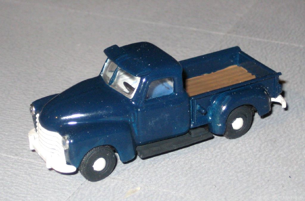 The interior was done in gloss white with gloss baby blue seats. The exterior is Ford Atlantic Blue from Hallfords. The truck bed is tan to simulate the wood. I ommited the spare tires. The normal tires received a coat of Nato Black to remove the whitewalls while the hubcabs were done in gloss white.