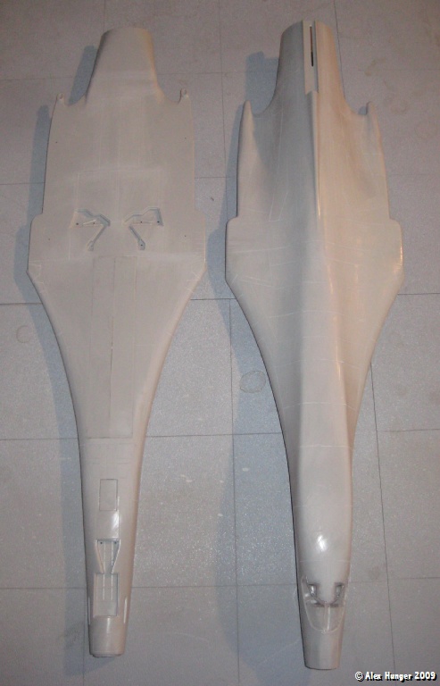 I dropped the flaps, reshaped the forward fuselage, recarved the panel lines, blocked up the air intakes, chopped bits out of the tail and the radomes. The white areas are Spraylat. The rest is dirt.