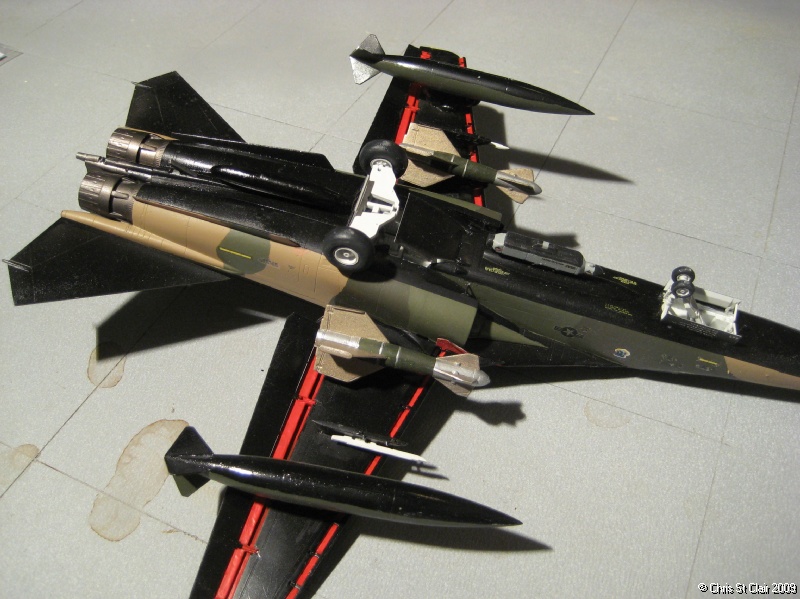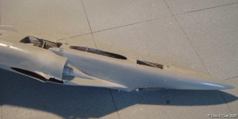 While the Hasegawa bomb bay doors for the Pave Tack unit was installed, I used a shortened and sanded down Hawker Hunter drop tank for the bulge istead of the kit Pave Tack device. The data Link pod was a sanded down resin drop tank from an unknown kit. Unfortunately it doesn't show up well on the photo due to the black background.
