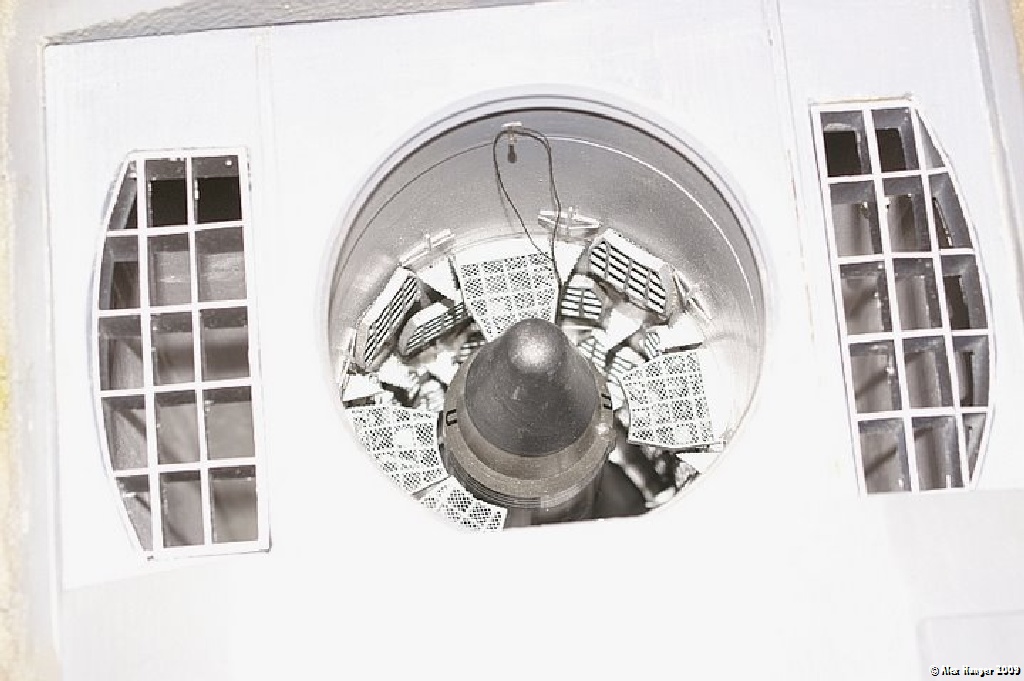 From my model railroad shop I found HO scale model chain-link fencing which I then super glued to the platforms. I think I stuck my fingers together more than anything else, but in the end, I had 32 platforms. From plasticard, I then cut 32 platform mounts, which were arc shaped to fit the silo sleeve on the rear and straight at the front to accept the platforms. 6 platforms were selected to be shown extended as these would then stabilize the top of the missile within the silo. On one part of the sleeve, a door was cut and shown open. Behind the door, I created a small chamber, which also received 2 red LEDs from a model RC car to illuminate the interior. This has yet to work due to my poor electrical competence! Further details made of stretched sprue and plasticard were added to the interior of the sleeve sections. All interior parts were spray painted in Hallfords Nissan Silver. The sleeves were then glued to the main silo tube and the tube was glued to the chassis.