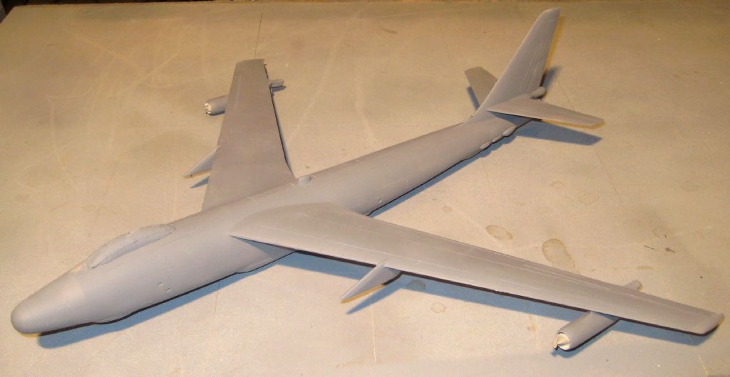 With the panel lines gone, I could then sand off all the paint in order to provide a smooth surface for the new paint job. That out of the way, I super glued, the new nose, wing tips and extra rear metal radomes and also cut a slot into the outer lower wing for 2 suspended antenna pods. The bulged resin bomb bay required some rebending in boiling water to fit properly as it had contorted while in storage. Even then, it required a couple of strips of plasticard and quite some filler to fit smoothly into the orifice. The guns could then also be reattached. I also nearly forgot to close up the holes for the drop tanks, as the RB-47H has not been photographed with them attached as far as I can tell.