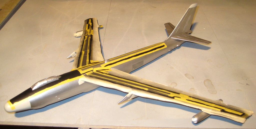 In the end, the resulting airframe looked good in Halfords grey primer and could be spray painted right away in Halfords Nissan silver. I then masked off the nose and rudder tip to be painted in gloss light grey as well as the airbrake and wing center sections to be accented in darker Allclad aluminum for just a little more contrast. I left most of the Tamiya tape on the wings in order to hand paint the wing walkway lines, though more had to be applied to the top of the fuselage for those lines and the anti glare panel. The gear bays were done in Zinc chromate. The whole lot was sprayed in Halfords gloss cote for better decal adhesion.