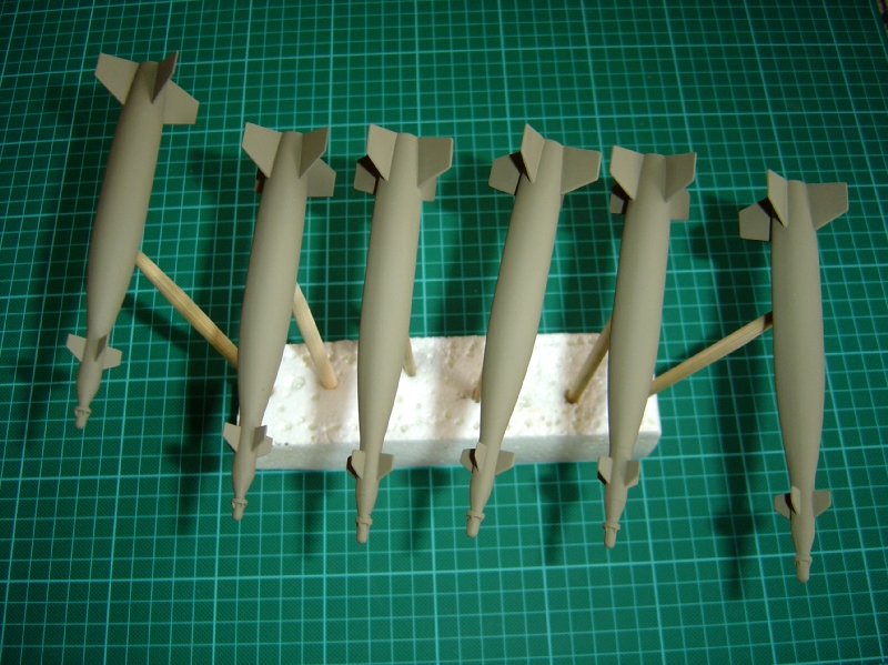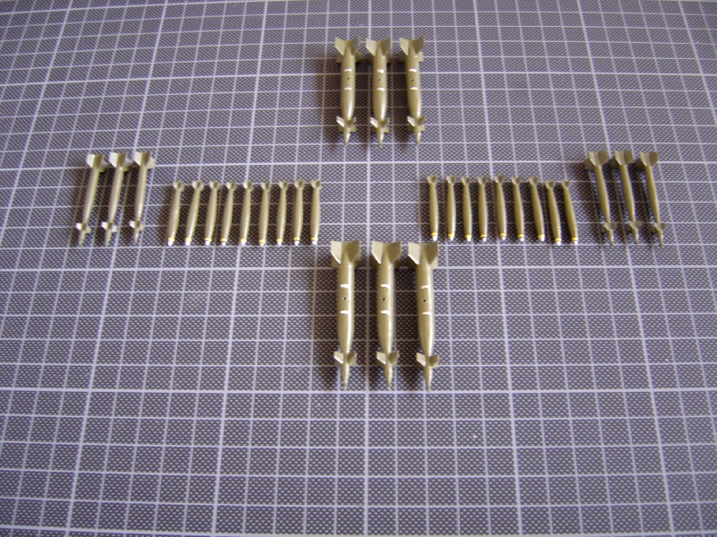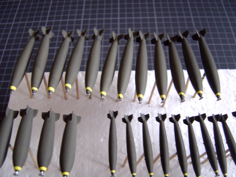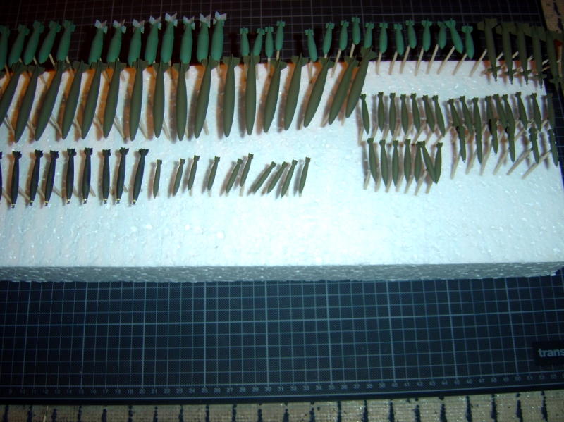 Mostly found on packaging electronis or buy an large plate of it in the stores. It has to be at least 3cm of thickness as you insert the bombs in it while drying. I only mention the USAF type here on the forum. Get all the bombs from the kit you are building. For example MER racks = Mutliple Ejection rack. MER holds 6 mk. 82 and for Vietnam most kits 12 Mk. 82 are included. If the bomb is good for you to use, than work on it like on a model. Keep details, but if there's no detail like hangingpoints or fuses than make sure you sand the bomb and get rid of flash. Find on the bomb a marking point where its safe to drill an small hole. 1mm should do it. Drill not to deep but deep enough so that a cocktail stick can be inserted. It has to hold the bomb, and it should clamp as you will handle it this way during painting of the bomb.