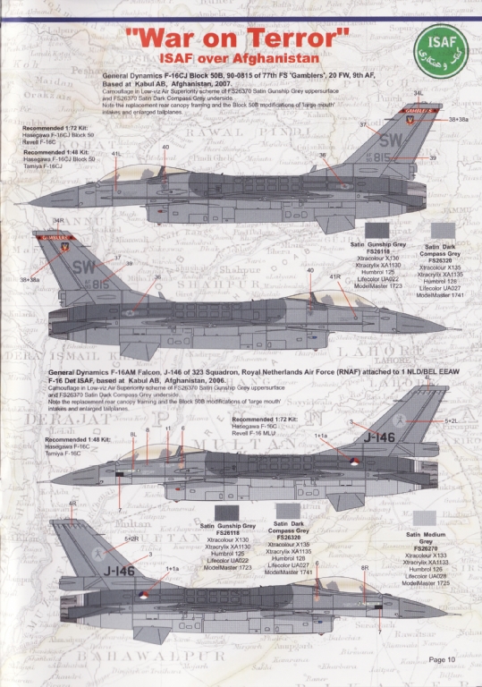 Overall the sheet is extremely crowded, with no less than 11 sets of markings for 9 different aircraft types from 8 different air forces! The markings of interest to us are for an F-16C Block 50B, being 90-0815 “SW” from the 77th FS “Gamblers”, 20th FW, 9th AF which was based at Kabul AB in Afghanistan during 2007.