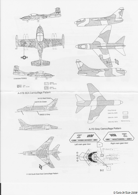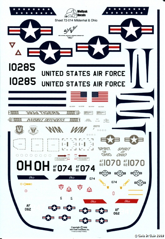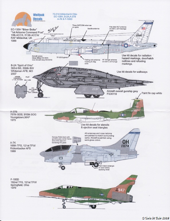 This sheet from Wolfpak Decals focusses on aircraft operated from RAF Mildenhall and also by the Ohio ANG. It features 5 different types - the EC-135H "Silver Dollar", B-2A "Spirit", A-37B, A-7K "SLUF" and F-100D Super Sabre.
