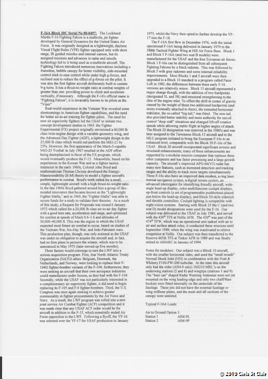 F-16A Block 10C 80-0497 from the 430th TFS, 474th TFW based at Nellis AFB, Nevada during 1981. The aircraft is in the standard three-tone grey scheme of FS36118, FS36270 and FS36375. It carries a white tail band with red chevrons and a black "NA" tailcode. It also has "4530 TFS AMU" on the fin and a falcon logo just behind the cockpit