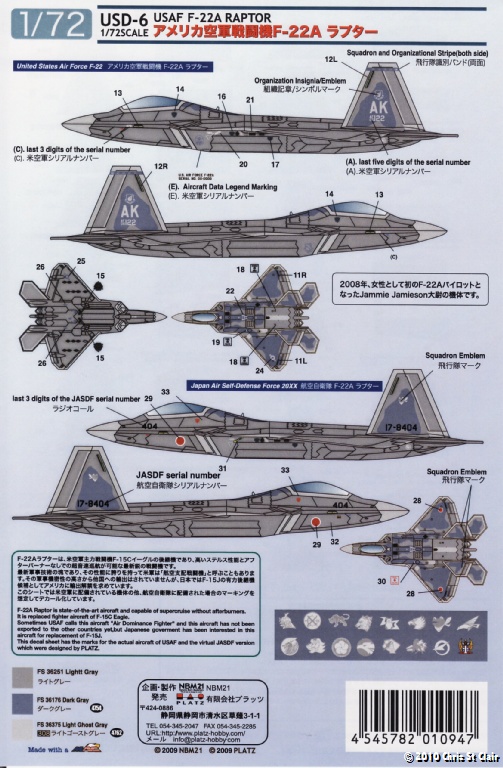Platz quote the colors for the Raptor as being FS36251 Light Grey and FS36176 Dark Grey (this being the "Mod Eagle" scheme as applied to the current F-15 fleet). Time will tell whether this is correct or not, as the debate about the "metallic" sheen to the F-22 finish has still not been resolved!