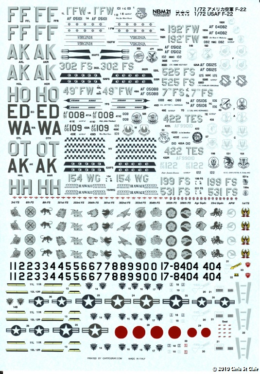 Platz is not a well-known name in the UK, but they have mastered the RQ-1 Predator kit reissued by Accurate Miniatures and Italeri, and are in the process of producing MQ-9 Reaper and RQ-4 Global Hawk kits. This is their first USAF-relevant decal sheet and covers the F-22A Raptor. The sheet covers virtually all USAF F-22A units as well as containing all squadron and wing badges for the Japanese Air Defence Force, who are potentially interested in operating the Raptor. The USAF airframes and units covered are as follows:-