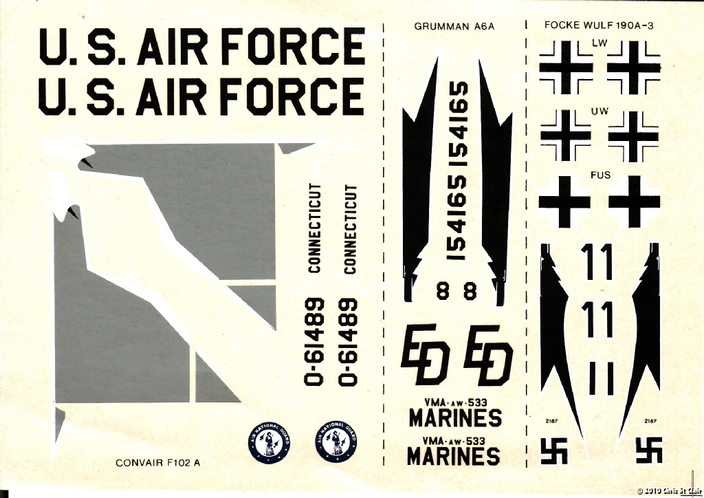 The aircraft featured are mainly non-USAF, but there is one subject of interest - an F-102A from the Connecticut ANG. Modelmark suggest that you paint the fin black then apply their decal which has the grey and white in the shape of an Eagle. I'm not sure this would work as the grey might be difficult to match, but I'm sure it would make an interesting subject.