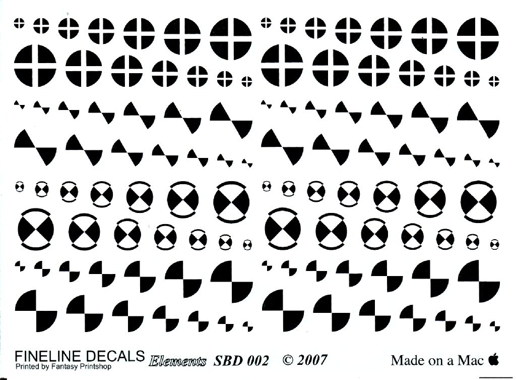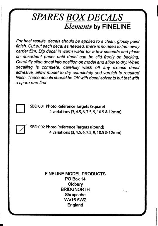 This is a useful sheet from Fineline Decals, and is very simple. It contains 4 different styles of Black & White photo reference targets, each in 7 different sizes.