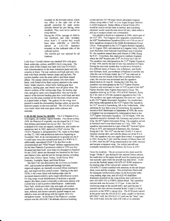 - F-4E-40-MC 68-0481 from the 512th TFS, 86th TFW at Ramstein AB, Germany during 1984. The aircraft is in the wraparound SEA scheme (FS34079, FS34102, FS30219) with a black/yellow chequered fincap, "RS" tailcode and "AF68 481" in black on the fin;