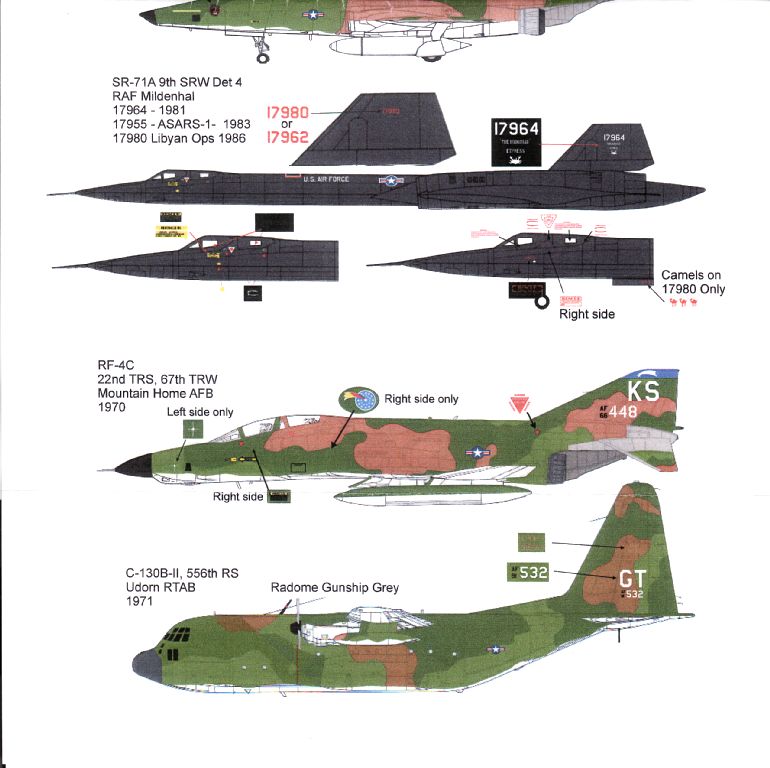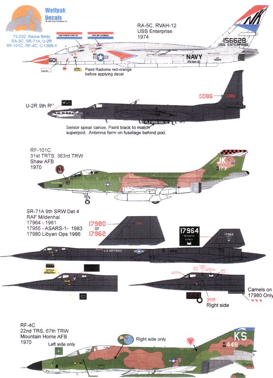 Sheet 72-032 "Recce Birds" from Wolfpak Decals covers a wide range of subjects, including the U-2R, RF-101C, SR-71A, RF-4C and C-130B-II:-