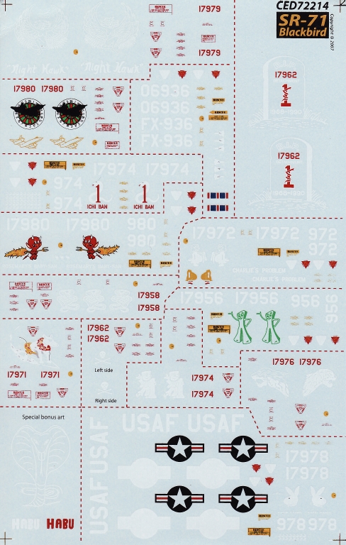 - SR-71A 61-79xx Habu - this was an SR-71A nose with the HABU markings applied. The only photograph shows the nose mounted on a maintenance stand in a hangar in the mid-1980's - you thus could potentially apply it to any SR-71 from that time period;