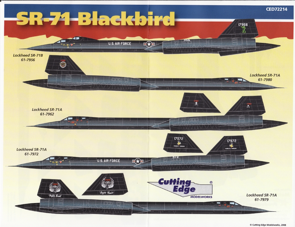 Additionally, for each airframe, Cutting Edge provide a details of the markings for each airframe (although little more detailed than above), and also note that the serial numbers noted in Aerofax Minigraph #1 was incorrect in noting the SR-71 serial numbers as being in the 64-1XXXX range; they were actually in the 61-7XXX range.